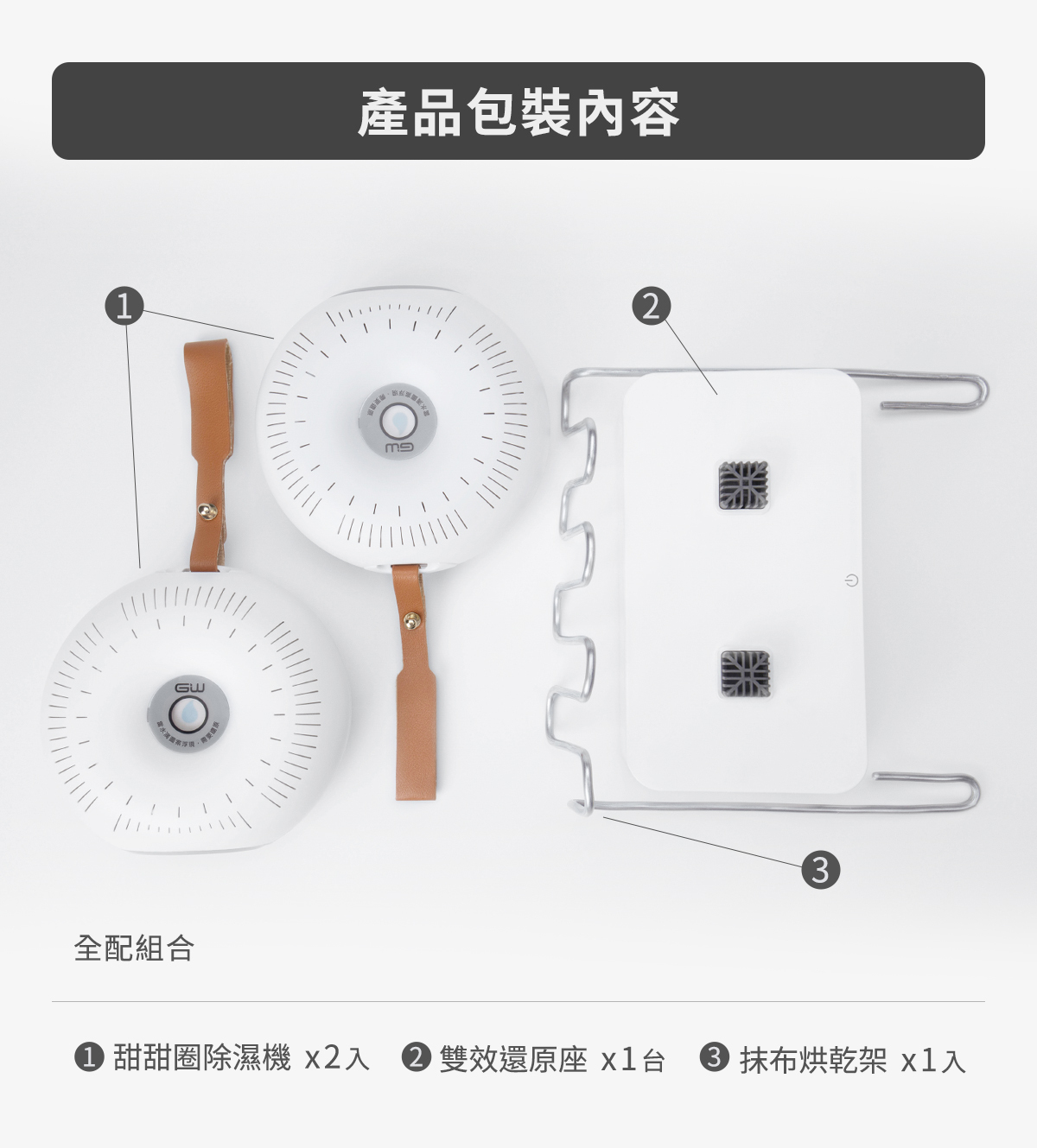 -全配組合:2.0甜甜圈除濕機*2 ,雙效還原座*1,烘乾架*1
