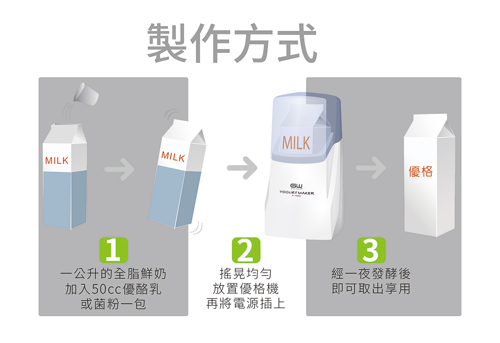 鮮乳、豆漿、沖泡奶粉皆可製作,需搭配優格菌粉或優酪乳